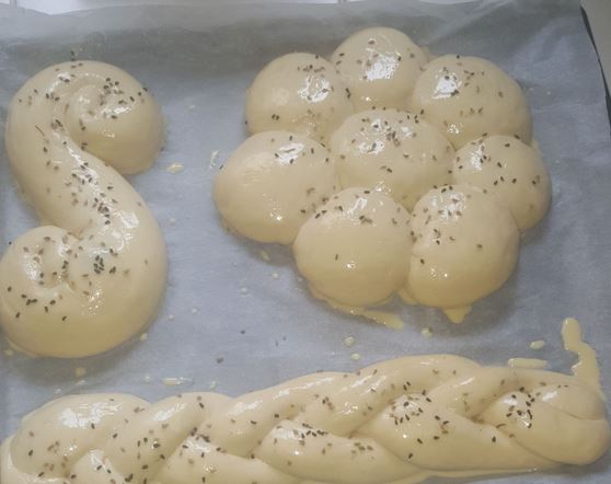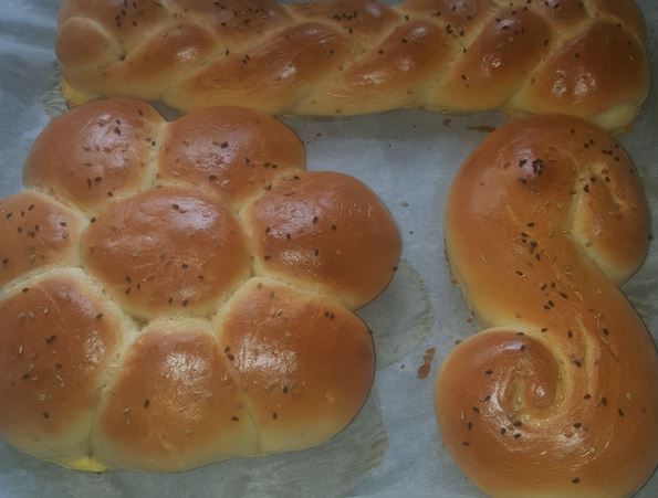 Pain tunisien d'Ayoub 1 Ingrédients : 500 gramme farine type 55, 1.c.s levure boulangère, 2 c.s huile d'olive, 1 c.c sel, 1 c.s sucre et enfin de l'eau pour pétrir. Faire diluer le sachet de levure boulangère dans 1/2 verre d'eau tiède avec le sucre et l'huile d'olive. Laisser agir 5 minutes la levure dans ce liquide et dans 1 récipient verser la farine et le sel ensemble. Versez ensuite le mélange de levure et l'eau petit à petit jusqu'à ce que la pâte soit collante et légère de consistance. Commencer à pétrir et faire une boule et laisser bien lever pendant 45 minutes. Ensuite étaler la pâte et faire des boules de même taille les mettre côte à côte en forme de cercle et une boule au milieu les rapprocher les unes des autres et laisser encore lever pendant 20 minutes. Pour la forme de tresse faire une tresse normale avec 3 parties de pâte déja roulée comme un serpent sans oublier de coller les extrémités entre elles et laisser agir 20 minutes. Mélanger 1 jaune d'oeuf, 1 c.s huile d'olive et 5 c.s de lait et passer ce mélange sur votre pain avant de le cuire il vous donnera le côté doré du pain . Pour ma part je verse par-dessus quelques graines de nigelle et d'anis vert c'est pour le goût relevé du pain. Vous pouvez vous amuser à trouver différentes formes avant d'enfourner r tout ça à 180° pendant 15 minutes tout dépend du four. Dès que le pain devient doré le retirer et une astuce en plus si vous voulez que votre pain soit plus tendre et doux par-dessus le mettre encore chaud dans un torchon propre pendant 15 minutes, vous aurez un bon pain doux et une légère croûte qui croustille sans être sec à l'extérieur car la chaleur du pain se garde bien dans le torchon et l'adouçit. Merci pour tous ces bons conseils ! |