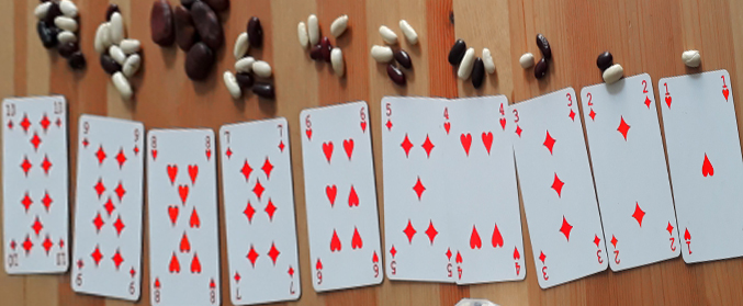 Associer deux quantités identiques:cartes à jouer et graines, Jack