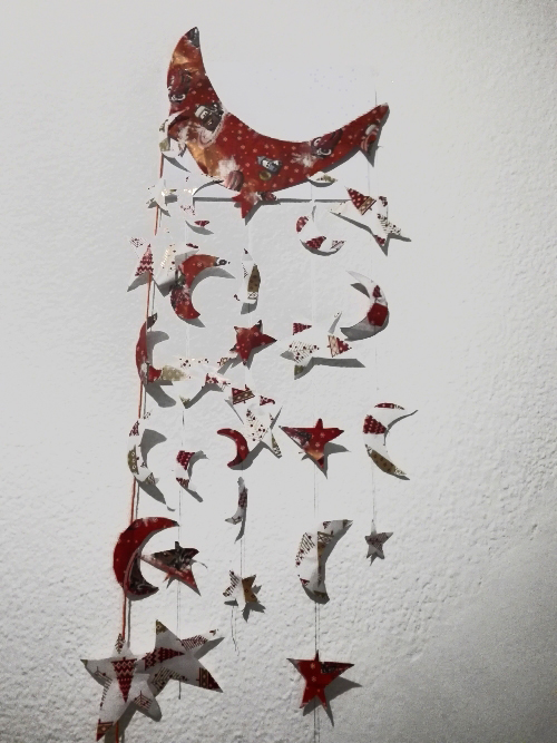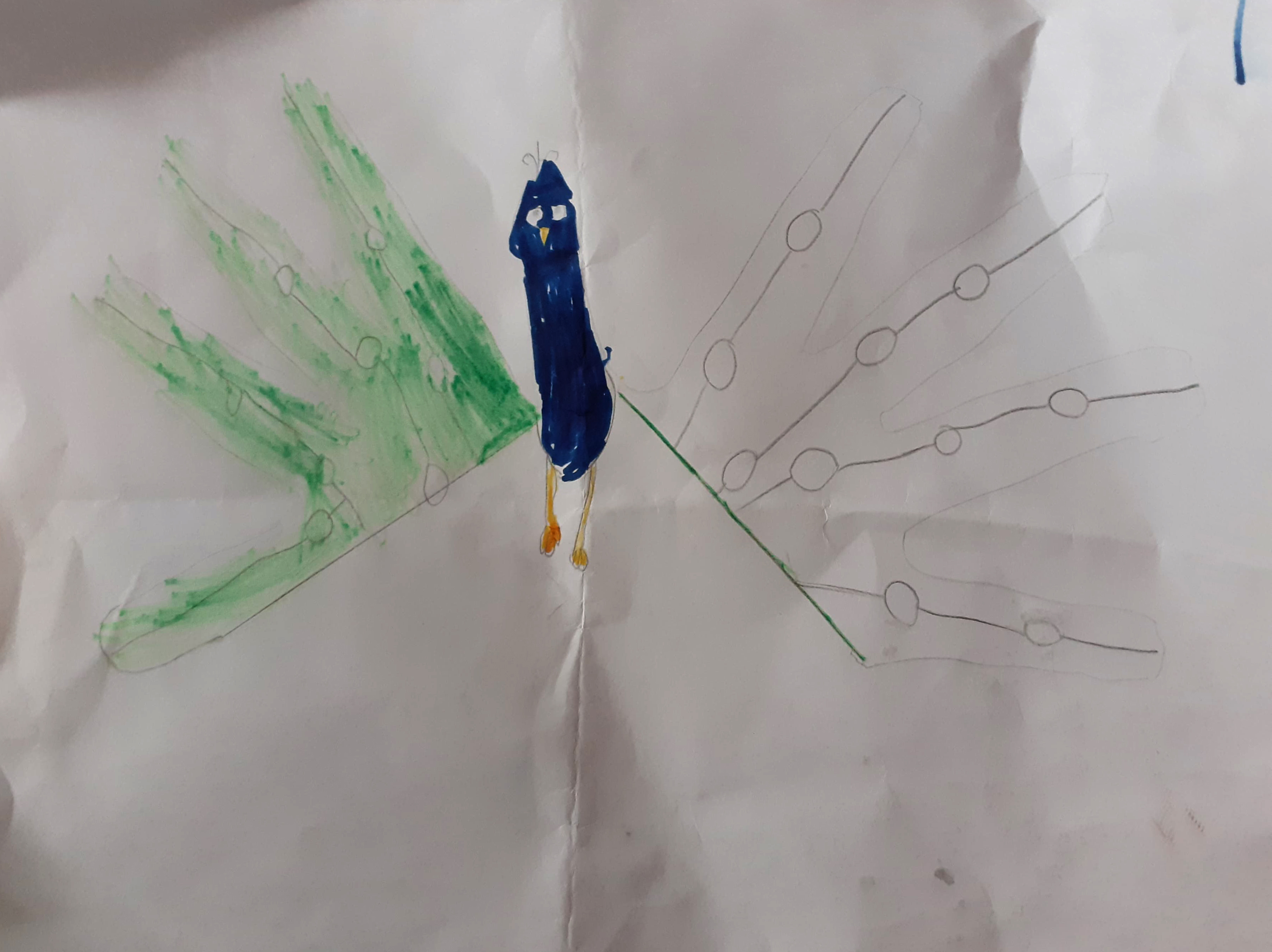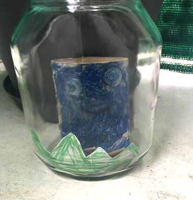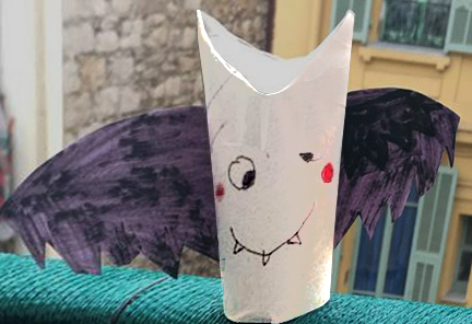 Ayoub 2 a fait des animaux avec un rouleau de carton: une chauve souris et un poisson dans un bocal!