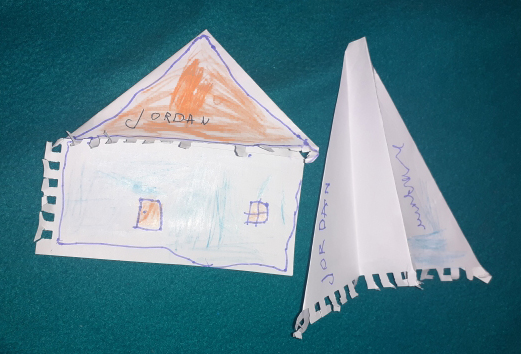 Jordan nous montre comment on peut faire une maison et un avion en pliant du papier.