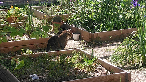 Et qui surveille le jardin pendant le confinement ? Un chat et l'épouvantail!
