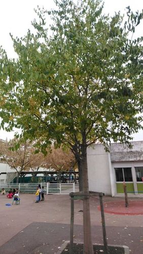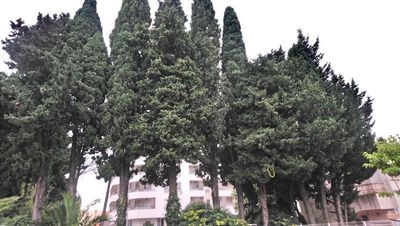 Il y en a trois. Sont-ils tous identiques ? Un est grand et les deux autres plus petits, un tilleul, un micocoulier et des cyprès.