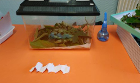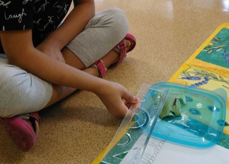 Avec cet élevage de chenilles, les enfants peuvent les observer et suivre leur cycle de vie. On espère pouvoir arriver jusqu'au stade de la formation du cocon et de la métamorphose en papillon.