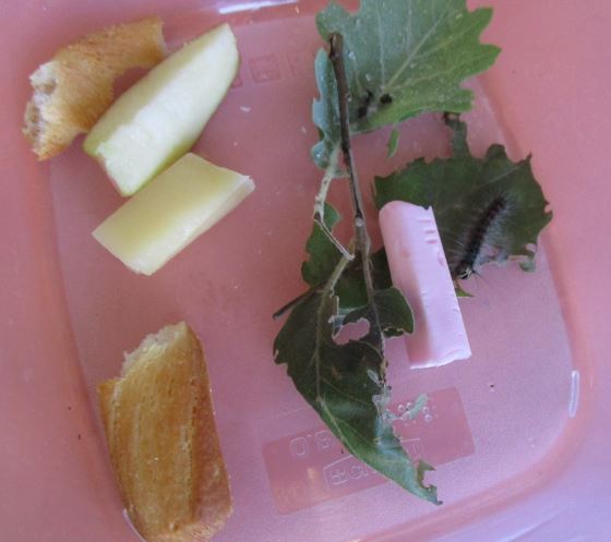 Puis, nous nous sommes posés des questions sur son régime alimentaire, dans le livre elle mange des fruits, des bonbons, du gâteau et du fromage. Nous avons donc mis tous ces produits dans la boîte et le soir nous avons regardé ce que les chenilles avaient mangé : rien de tout cela, seulement les feuilles d'arbres !
