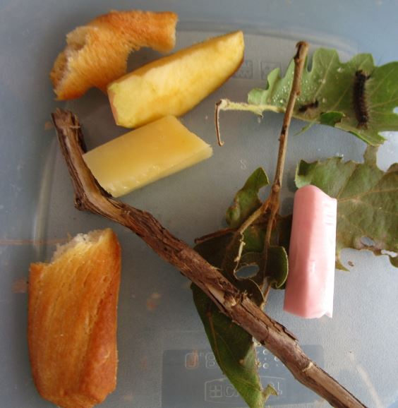 Dans le livre d'Eric Carle, la chenille attrape une indigestion car elle a trop mangé de fromage, de gâteau et de fruits...Nous avons mis ces produits dans la boîte de nos chenilles pour voir si elles en mangeraient:
